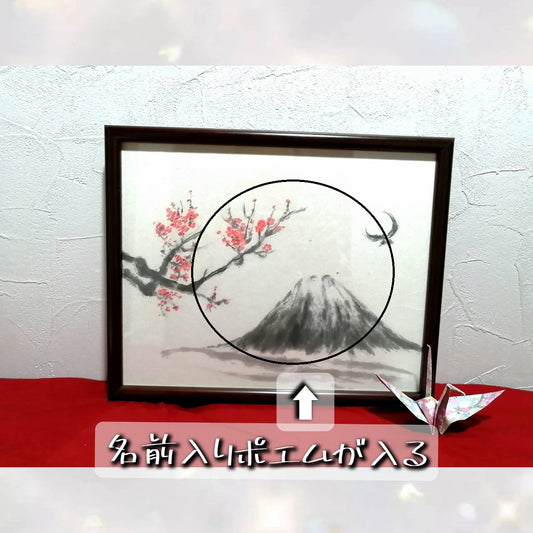 【図案番号(1-9):富士と紅梅】(1人用)水墨画と名前入りポエム